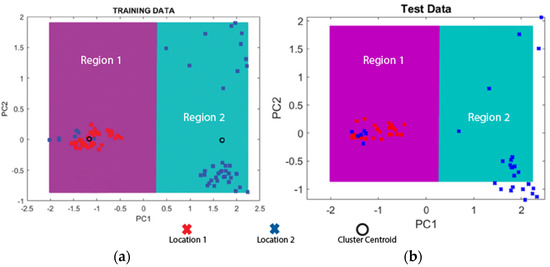 Figure 9. Data classification of location 1 and location 2: (a) Training data; (b) Test data.