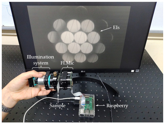 In Figure 2, a photograph of the handheld and cost-effective FLMic is shown. The microscope was built with an M12 lens ( and mm), manufactured by ArduCam®. The chosen MLA has a focal length of mm and pitch of mm (model APH-Q-P1000-R3.63, manufactured by AMUS®). As a digital sensor, an HQ Raspberry-Pi Camera with square pixels of μm, was selected. For illuminating the sample an off-the-shelf ultra-bright blue LED, with emission peak wavelength of 490 nm and a full width at half maximum (FWHM) of 40 nm, was used. The picture also includes the Raspberry-Pi utilized to control the digital camera and the illuminating LED.