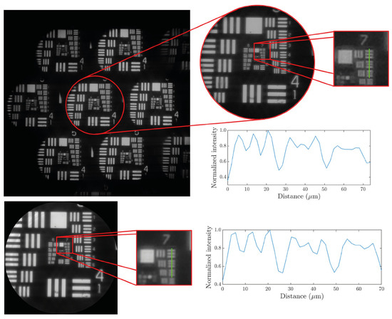 To show the effectiveness of the handheld and cost-effective FLMic, several experiments were completed. In the first experiment, the spatial lateral resolution of the microscope was studied by imaging a negative hi-res USAF 1951 test target. Figure 3 shows, in the upper row from left-to-right: the complete set of the recorded EIs, the zoomed-in central EI, and a zoomed-in area including the elements from 1 to 4 of group 7. The set of recorded Els shows the 3,2 EIs (along the horizontal direction) for which the lightfield microscope was designed. From the zoomed-in area of the elements of group 7, an intensity profile along the green line is plotted. Here, the reader observes that the microscope can resolve with a contrast of 10% the element 1 of group 7, namely, it has a spatial resolution limit of µm (or equivalently a cut-off frequency of 128.0 lp/mm). The lower row of Figure 3 shows the same resolution study for the reconstructed image at the best focus plane. As it can be observed, both the reconstructed image and the EIs show the same resolution. From the same set of EIs images shown in Figure 3, the FOV of the microscope was measured to be 0.95 mm in diameter. Note that these two values are in very good accordance with the expected theoretical ones.
