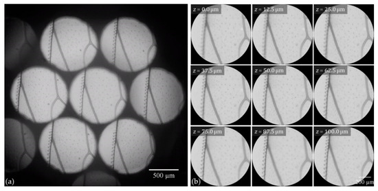 Once the optical performance of the FLMic was evaluated, its feasibility to capture the three-dimensional information of thick samples was tested, both in bright-field and fluorescence imaging. As a bright-field sample, a honeybee wing was utilized. The captured EIs are shown in Figure 4a. Using the seven non-vignetted EIs, nine refocused planes were computed by means of the S&S algorithm, which are presented in Figure 4b. The axial step between the refocused images for this configuration is 12.5 µm. In Video S2 of Supplementary Materials we show a movie in which the frames are refocused images.
