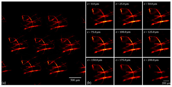 The handheld FLMic microscope can be also applied to obtain images of fluorescent samples. For the next experiment, a sample of a knot of cotton fibers, dyed with Rhodamine 123, was utilized. The set of recorded EIs is shown in Figure 5 panel (a). Instead of applying the classic S&S algorithm, the shift and multiply (S&M) algorithm was utilized to take advantage of its optical sectioning capability in the case of sparse fluorescent samples. In panel (b), several refocused images are presented. A 3D rendering, obtained by applying to these depth planes a maximum intensity projection (MIP) algorithm, was also created. The 3D rendering is composed of 46 refocused planes, so the rendered volume has a size of 950 × 950 µm2 in the transverse axes and 575 µm in the axial one in the object space. In Video S3 of Supplementary Materials, different views of the said rendering are shown. The voxel size of the rendering is 1.89 × 1.89 × 6.25 µm3, where the larger side corresponds to the axial direction.