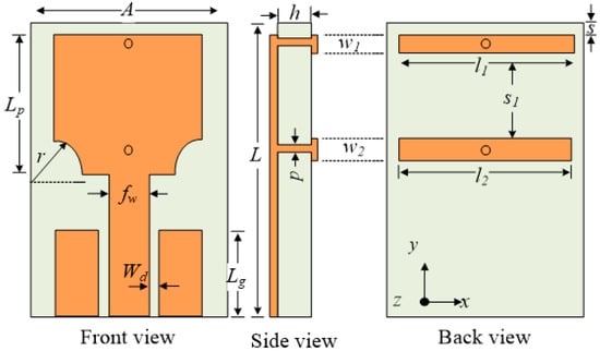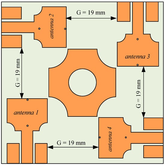 Since the Federal Communication Commission (FCC) has set 3.1–10.6 GHz as ultrawideband technology, this has attracted the interest of researchers by offering features like short-range, high bandwidth, low energy usage, low complexity, and high data rate communications []. The applications of UWB include short-range communications, sensor networks, tracking, and positioning systems [,]. In the multi-path environment, signal fading degrades the performance of UWB systems, which affects the efficiency and quality of signal transmission. To address this problem, Multi-Input-Multi-Output (MIMO) technology has been used to provide a multi-element patch antenna for signal transmission or reception. It can significantly increase spectral efficiency, reliability, and channel capacity without utilizing extra power and spectrum. Hence it is widely used in the design of antennas in different networks to enhance the performance of communication systems. However, the usage of more than one radiating element, closely arranged to one another in MIMO degrades the performance of the system. Therefore, the design of a MIMO system with better isolation is required in modern communications. The UWB-MIMO design with low isolation by keeping a minimum distance between antennas is challenging. So far, different isolation techniques have been used by researchers to reduce mutual coupling in the MIMO antennas [,].