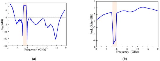 The single-element antenna is shown in Figure 1. The antenna has an operational bandwidth of 3–12.8 GHz for |S11| < −10 rejecting WLAN band signals rectangularly with high selectivity. The size of the single element antenna is 16 × 25 × 1.52 mm3 and it has stable gain and radiation patterns. The impedance characteristics of the antenna in terms of |S11| and gain are shown in Figure 2. The gain curve is stable with the maximum value of 4.5 dBi until rejected band where it sharply decreased to about −6 dBi.