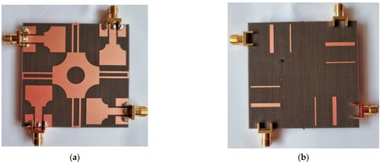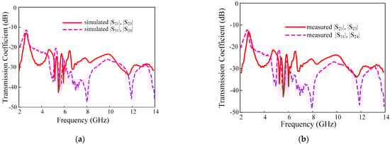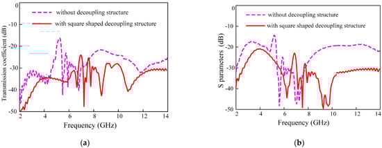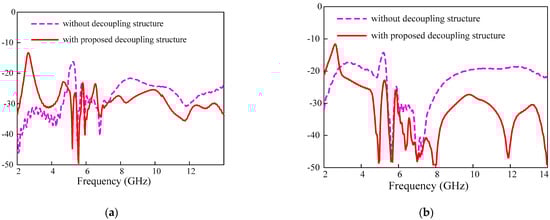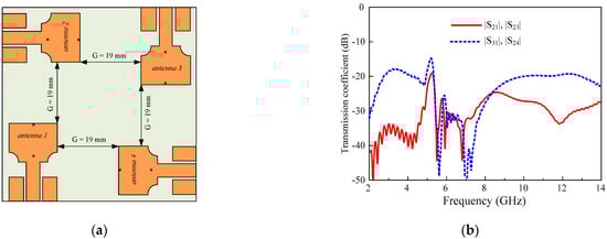 In MIMO systems, the mutual coupling between the single elements can be expressed as a transmission coefficient. The measured and simulated results are compared in Figure 11. The antenna elements have high isolation characteristics without the proposed decoupling structure.