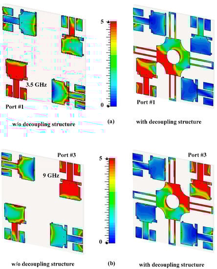 To understand the electromagnetic behavior of antenna elements and decoupling structure, the surface current distribution for both adjacent and diagonally placed elements is studied. The effectiveness of the decoupling structure can be observed from Figure 8a in which a current at frequency 3.5 GHz has been shown with and without decoupling structure for port 1. While Figure 8b shows the current at frequency 9 GHz with and without decoupling structure for port 3. It can be seen that without decoupling structure, the non-exciting ports also show current which is because of inducting behavior of conducting materials due to nearby current exciting elements. While after introducing a decoupling structure in between these elements, the non-exciting element does not show current flow, because the decoupling structure minimizes the current flow towards others.