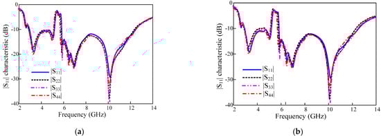 The entire UWB spectrum (3–12.8 GHz) shows good impedance matching except for the notched band. The proposed fabricated antenna under measurement was rotating to measure the values of peak gain at different orientations. The simulated and measured gains of the antenna elements at 3 GHz, 5 GHz, 7 GHz, and 9 GHz are shown in Table 2. During the measurement, only one port excited the remaining ports are terminated with a 50-Ω load. The peak gain in the MIMO antenna is 6.94 dBi, increased by 2.44 dBi than a single element which is 4.5 dBi. This increase of the gain in the MIMO antenna system is due to the current redistribution, of more than one radiation element. In literature, there are various techniques used to enhance the gain of antennas such as using metasurface in the near-field of the antenna, additive manufacturing, and more [,,,,,]. However, this work utilizes a parasitic isolator for isolation as well as gain improvements.