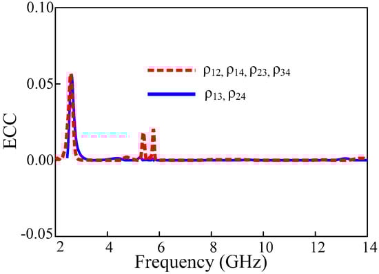 The ECC of MIMO can be calculated using S-parameters and far-field radiation patterns using Equations (1) and (2), respectively.