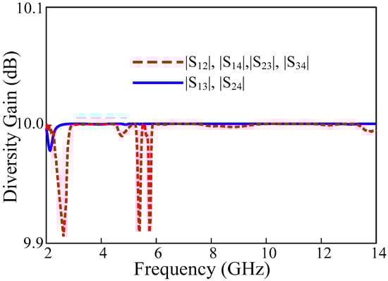 Using diversity gain, the effect of the diversity scheme on the radiated power can be described. Figure 13 shows the diversity gain of the proposed MIMO antenna which is a flat line in the ideal value for 10 dB for all four elements except the notched band. The DG is computed as a function frequency using relation (3).