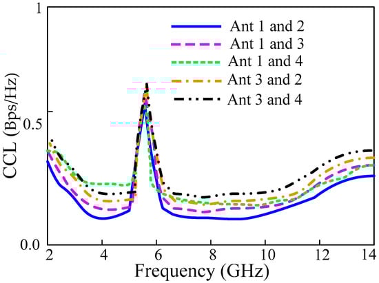 The CCL graph shown in Figure 14 demonstrates that the antenna CCL is than 0.4 bps/Hz for the entire UWB band except for the rectangularly notched WLAN band.