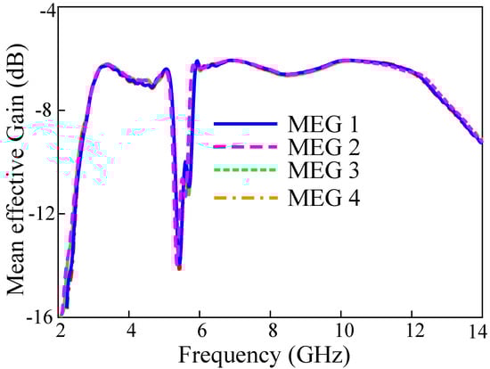 where i represent the port under observation and N is the number of antennas in the MIMO system. The MEG of the proposed MIMO antenna is shown in Figure 15. The MEG values are very low (less than −12 dB) at the stop-band, while it is around −7 dB within the frequency range of interest.