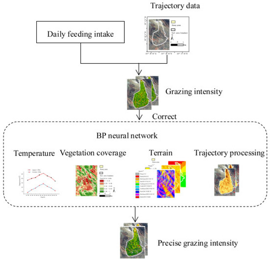 The purpose of this study was to explore the true grazing intensity of sheep in a specific area and evaluate grazing intensity using grazing sheep trajectory data. However, experiments and studies have found that the grazing behavior of sheep in the real environment is affected by many factors, such as the duration of the sheep’s trajectory segment (T), the walking distance (C), the slope of the test area (P), the elevation (E), the aspect (D), the vegetation index (NDVI), the sheep weight (S) and the temperature (F). In order to obtain an accurate fitting model of the grazing intensity of sheep, the BP neural network is used to analyze these factors. The result shows that there are five factors that have a greater impact, namely vegetation index, sheep weight, duration, moving distance and ambient temperature, and the coefficient of determination of the new model is = 0.97, and the mean square error is MSE = 0.73. It is proved that the correlation is strong and the error is small. After that, the grazing intensity data is registered to form a picture with strong observation and readability.
