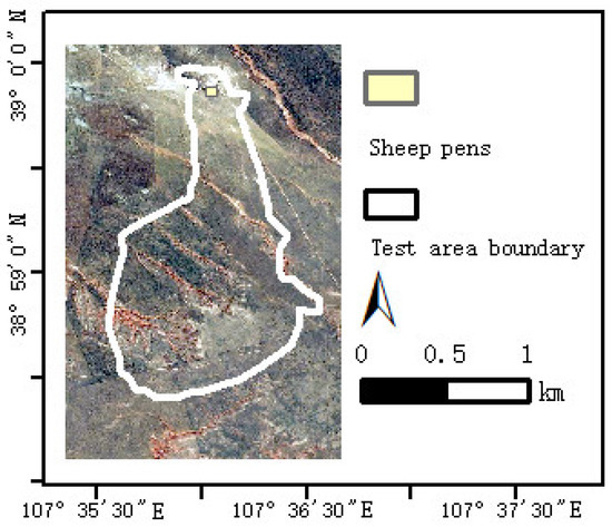 The test area is located in the desert grasslands of Wulanhua town to the west of Ordos city, Inner Mongolia. The grazing prohibition period starts from April to the end of June. In winter, the grassland is withered and mostly covered with snow, so August (summer) and October (autumn) are selected as the typical months for the data analysis of sheep grazing trajectory. The size of the test area is about 210 hectares; the climate is an arid and semi-arid continental climate zone with long and cold winters as well as short hot summers. The coordinate of the grazing grassland is from 38°58′22″ to 39°0′03″ of north latitude and from 107°35′20″ to 107°36′39″ of east longitude. The experimental area is shown in Figure 2, in which the sheep shed is located at the north corner of the grassland. There are about 200 sheep that leave the pen to graze at about 6 o’clock every morning and return to the pen from 6 to 8 o’clock in the evening. We selected two sheep from this flock as experimental subjects. GPS collars were installed on the two sheep.