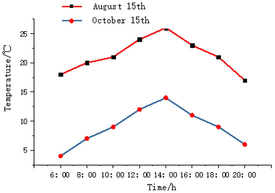 Due to the poor heat resistance of sheep, the appetite of sheep decreases when the temperature is too high, hence the feed intake will decline or even stop. The daily temperature parameter is used as an influence factor of the sheep’s grazing behavior. Figure 3 is the temperature parameter change curves of the test area on August 15 and 15 October 2020, corresponding to summer and autumn, respectively.