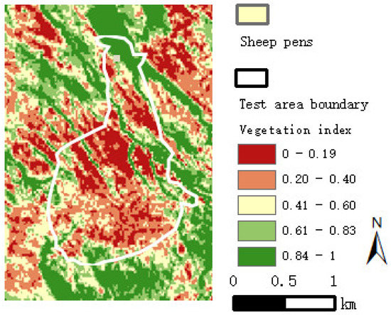 where is the spectral value of near infrared band, is the spectral value of red band. The NDVI value is between 0 and 1. The NDVI value is proportional to the vegetation coverage in the study area, and the NDVI value distribution in the test area is shown in Figure 5.