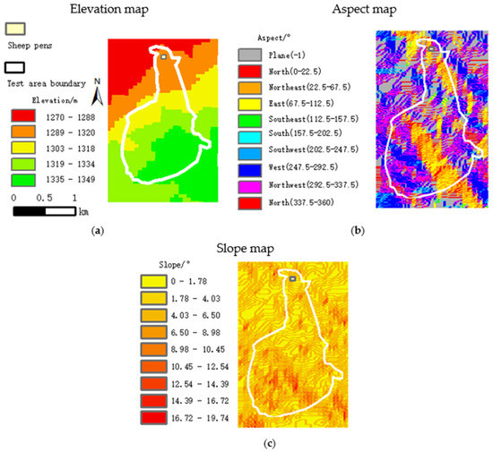 Topography factors such as elevation, slope and other aspects in the test area have a certain impact on the grazing behavior of sheep [10]. The ASTER GDEM 30 m resolution remote sensing elevation image was selected to obtain the aspect, slope and elevation distribution of the test area as shown in Figure 6.