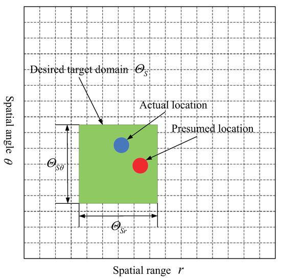 Assume that the target region in the whole range-angle domain, where the possible spatial range and angle of target locates, is known in prior, as depicted in Figure 3. The presumed target position inside the target domain is inconsistent with the actual target position, that is, there is a mismatch between the presumed target spatial range and angle and the actual target range and angle. Define the interval of possible target spatial range r and angle as and respectively, which can be determined using range measurement methods and DOA estimation techniques, then can be denoted as .
