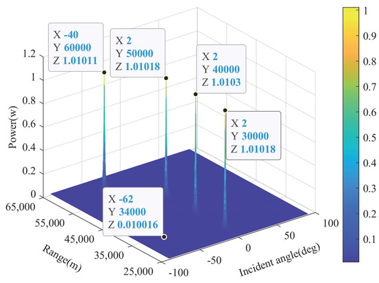 (25) illustrates that the power estimation at the desired target spatial position contains signal and residual noise. Figure 4 exhibitions the power amplitude in whole range-angle space according to (22), where the receiving and transmitting elements of FDA-MIMO radar are , the power of one desired target at and three jamming at , and are set as 1w, respectively, and complex Gaussian white noise with variance is employed. It is observed that the power fluctuates around 0.01w in the range-angle domain away from the spectral peak, confirming (24). Furthermore, the power at four spectral peaks is roughly 1.01 w, which exceeds their actual value of 1 w and is consistent with (25).