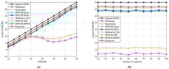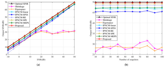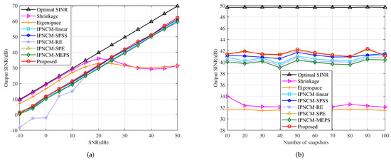 where represents the Euclidean norm of and is uniformly distributed in the interval [0,6]. signifies the phase of the random vector error, which obeys a uniform distribution in the interval . The SV random error model established in (50) can be interpreted as a result of numerous error factors including look direction error, array calibration error and so on. The relationship between the output SINR and input SNR of the tested beamformers is described in Figure 15a. When −10 dB < SNR < 50 dB, the proposed method has the highest output SINR among the IPNCM-based beamformers, and also outperforms the Shrinkage beamformer and Eigenspace beamformer if SNR > 20 dB. This is because at high SINR, the desired signal in the training sample has a significant influence on the sample covariance matrix, whereas the propose method and other the IPNCM-based beamformers construct the IPNCM by integrating the region where the jamming domain is situated, which removes the effect of the desired signal to a degree, resulting in excellent performance under high SNR conditions. When SNR < 20 dB, the Shrinkage beamformer and Eigenspace beamformer outperform the IPNCM-based beamformers because the former two employ the enhanced covariance matrix instead of the sample covariance matrix, which guarantees the robustness against SV random error. However, these IPNCM-based beamformers presume that the antenna array has no calibration errors (for example, the channel gain and phase error, and array geometric error). As previously stated, the SV random error contains numerous error factors, including the array calibration error, which causes the IPNCM-based beamformers cannot handle the SV random error adequately under low SNR. These analyses are also consistent with the simulation results for array geometry error, gain and phase error illustrated in Figure 11 and Figure 12.