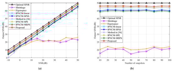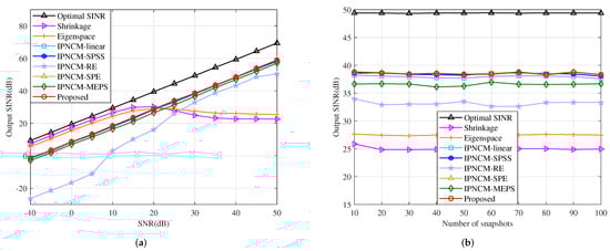 The optimal beamformer weight vector after maximizing (48) can be obtained from the principal eigenvector of [46]. Figure 13a,b depict the output SINR of the tested beamformers versus the input SNR and versus the number of snapshots, respectively. It can be deduced that the proposed beamformer provides a more satisfactory performance in a large SNR interval as well as in the case of small samples, and its output SINR is higher than that of the remaining beamformers, which reveals that the proposed method has extremely robustness for the incoherent local scattering problem of the signal. Furthermore, the IPNCM-linear beamformer, IPNCM-SPSS beamformer and IPNCM-MEPS beamformer perform comparably and significantly worse than the other IPNCM-based beamformers, owing to the fact that they reconstruct the IPNCM in such a way that the integration interval of the interference is the entire remaining range that does not comprise the desired target domain, which increases redundant information resulting in a performance degradation.