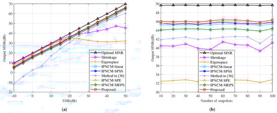 In this example, the effect of random look direction and range error on beamformer output SINR is demonstrated. The random DOA errors of both the desired signal and the jamming are uniformly distributed in , whereas their random range errors are set to be uniformly distributed in . This indicates that the actual desired target DOA is uniformly distributed in and the range is uniformly distributed in . The three jamming DOAs, however, are uniformly distributed in , and , where their ranges are specified to obey uniform distribution of , , and . Note that the angle and range of the desired target, as well as the jamming, vary in each independent trial while maintaining constant among the training samples. Figure 10a plots the output SINR versus input SNR of several tested beamformers. It can be seen that both our proposed method and the IPNCM-SPE beamformer are close to the optimal solution at SNR > 10 dB. Moreover, they have superior performance over the remaining beamformers when −10 dB < SNR < 50 dB. The proposed method and these beamformers based on interference plus noise covariance matrix reconstruction generally outperform the Shrinkage and Eigenspace beamformers at high SNR due to the fact that the interference covariance matrix of the two techniques still contains the desired signal, which can severely attenuate the useful signal output power at high SNR, leading to a decrease in SINR. The curve of output SINR chinging with the number of input snapshots is exhibited in Figure 10b. It is evident that the proposed beamformer basically attain the optimal value and converge substantially faster than the other approaches under low and high snapshot numbers.