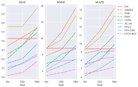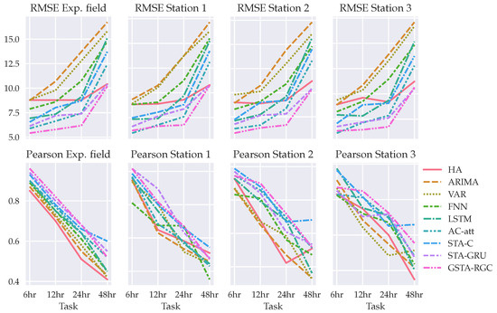 In general terms, we can separate the results from non-deep learning models and FNN from LSTM, autoencoder and graph-based neural network architectures. Non-deep learning models (HA, ARIMA) and the simple deep learning architecture FNN only have similar error scores with the other architectures on the 6 h task. For a greater time-window, their performance drastically decreases. Then, we can compare results from LSTM with the results from STA-C, the variation of the spatio-temporal GNN with attention mechanism, and a convolution-based forecasting method. For this dataset, the complexity added by STA-C does not have an impact on the performance of the model and a simple LSTM is preferable, especially for 6 h, 12 h, and 24 h predictions. As mentioned previously, the autoencoder architecture with attention mechanism performs better than STA-C and similar to STA-GRU for 6 h, 12 h, and 24 h tasks. Finally, our model outperforms all the previous baselines. In our case, the complexity of the modeling successfully increases the performance of the prediction for each time-window task.