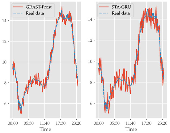 On left, there is a comparison of GRAST-Frost model with real data; on right, a comparison of STA-GRU model with real data.