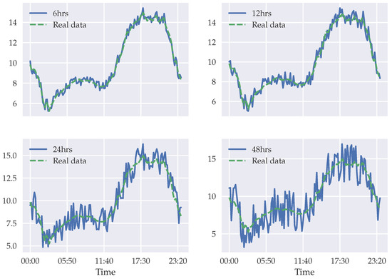 In addition, Figure 8 and Figure 9 show real and predicted data for a specific day. In Figure 9 we present the variation of our model prediction regarding 6 h, 12 h, 24 h, and 48 h tasks. Our model’s best performance is in the 6 h window task, and then the performance decreases gradually. Although the performance decreases for larger time windows, our model is capable of detecting the temperature trend. The range of the error interval increases if we want to make the prediction point by point, but if that range is detected, we can be sure that the prediction is reliable. Figure 8 shows our model prediction and the second-best prediction (STA-GRU) in the 6 h task. Both models detect the temperature trend, but in our model the error range is smaller.