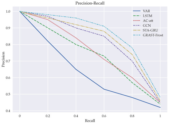 The proposed model outperforms all the compared baselines for frost forecast in 6 h, 12 h, 24 h and 48 h tasks. A nongraph model such as an autoencoder with an attention mechanism outperforms GNN with spatio-temporal attention using convolution and GRU. To improve these results, it is necessary to collect more weather data and weather variables and to use more weather stations for modeling geographical and temporal interactions.