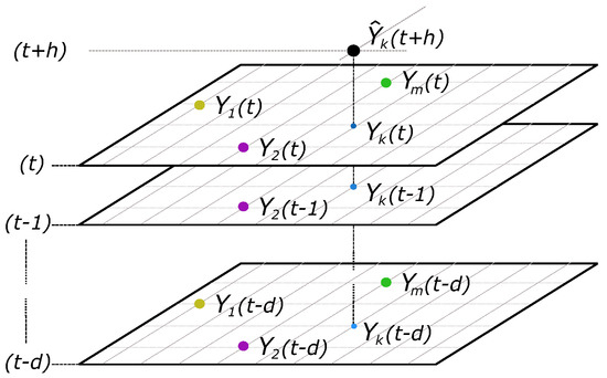 Y ^ k ( t + h ) = f ( Y 1 ( t ) , Y 1 ( t 1 ) , Y 1 ( t 2 ) , , Y 1 ( t d ) , Y 2 ( t ) , Y 2 ( t 1 ) , Y 2 ( t 2 ) , , Y 2 ( t d ) , , Y m ( t ) , Y m ( t 1 ) , Y m ( t 2 ) , , Y m ( t d ) ) ,