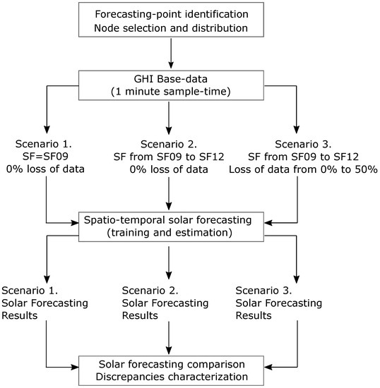 This work aims to evaluate the influence of LoRa performance characteristics and its architecture/layout on the short-term PV forecasting, by considering the RF model described in Section 3.2. Firstly, a node selection and distribution based on LoRaWAN technology is carried out according to a predefined forecasting point of interest and a possible group of potential on-ground sites or satellite based-installations. From these specifications, a one-minute sample time database is defined on each node, as well as the forecasting point of interest. The RF algorithm is used to find a suitable predictor function f and, then, to forecast short-term solar values on such location by considering different forecasting time intervals—from 15 to 45 min. These predictions are estimated under a variety of scenarios: (i) assuming SF = SF09 for all nodes and 0% loss of data; (ii) assuming SF from SF09 to SF12 on each node and 0% loss of data; and (iii) assuming SF from SF09 to SF12 on each node and loss of data from 0% to 50%. Subsequently, the solar forecasting values corresponding to the different scenarios are then compared. Discrepancies and similarities are calculated, discussing the influence of the different realistic LoRa parameters on the solar forecasting process. As previously analyzed by the authors in [83], different metrics can be found in the specific literature to determine discrepancies. From this classification, normalized root mean square error (nRMSE), mean absolute percentage error (MAPE), and dynamic time warping (DTW) are determined to provide complementary information and characterize convenient discrepancies among the PV short-term forecasting data by considering SF09 and 0% loss of data and the rest of scenarios. Figure 4 summarizes the proposed methodology. In addition, a sensitive analysis based on SF parameter and loss of data variability is also included, determining the differences among discrepancies with respect to the forecasting PV values with SF09 and 0% loss of data. The methodology and simulations were implemented in the R–environment [84]. Different contribution software packages were used for methodology implementation purposes. In this case, data.table for fast and memory efficient data manipulation [85], ranger for a fast RF implementation [80], and dtw and dtwclust for the DTW metric estimation [86].