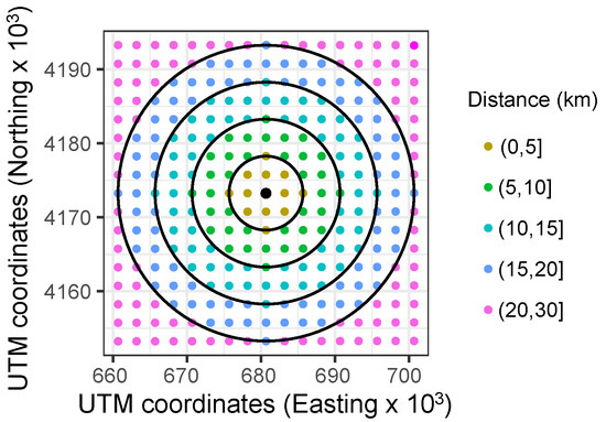 According to the proposed methodology described in Section 3.3, the LoRa node distribution is then selected by considering the initial grid depicted in Figure 5. With this aim, Figure 7 gives a general overview of the distribution of potential nodes, including UTM coordinates. Duda and Heusse [63] affirm that a more realistic assumption is to consider that the node density decreases with the inverse square of the gateway distance: a specific intensity of physical quantity is inversely proportional to the distance square from the source. Nevertheless, one node by each circular crown is considered and, thus, a homogeneous and minimum density distribution is considered to be evaluated and compared for short-term PV forecasting purposes. With regard to the LoRa parameters, and as can be found in the specific literature, the lowest transfer rate ensures the highest level of collisions [91]. Indeed, this configuration is the most used one, as it ensures the largest communication range by using a high SF (e.g., SF = 12). Therefore, a trade-off is then determined between increasing the communication range and reducing the transfer rate. As described in Section 3.1, different SF values are also considered in the different conditions. Therefore, different scenarios are considered for each day from the initial grid depicted in Figure 7, with forecast horizons ranging from 15 to 45 min with one-minute time resolution, and under a variety of SF LoRa parameters and loss of data values (see Figure 4). A general comparison of GHI prediction results for the case study is following discussed in Section 5.