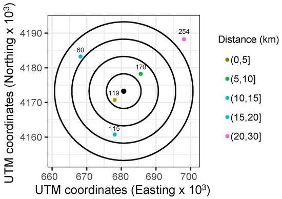 From the data corresponding to 2019, with one-minute time resolution, and as described in Section 4, different short-term PV solar forecasting periods were considered for simulations. More specifically, three different time horizons were defined: 15, 30, and 45 min. Each day was then simulated by considering such different time horizons for forecasting purposes. In addition, and with the aim to compare the impact of both loss of data and the selected SF, simulations were carried out under such conditions: 0%, 25%, and 50% loss of data; as well as from SF12 to SF09. Indeed, and according to the discussion given in Section 3.1—see Table 2 and Table 3, the selected SF considerably affects the robustness at the cost of lower data rates. These results allow us to evaluate the impact of each parameter and give a preliminary analysis of the influence of these conditions and situations before implementing a real communication and sensoring network. Therefore, each day is simulated through a 3 × 4 × 3 matrix of possible loss of data, foresting time intervals and selected SF, as schematically depicted in Figure 8. Subsequently, 36 different conditions are considered for each day, including three different losses of data percentages, four different SF parameters, and three different forecasting time intervals. In line with the case example shown in Figure 5 and the initial node layout based on UTM coordinates and depicted in Figure 7, an arbitrary node site location is selected and given in Figure 9, including the distribution of selected points for the analysis and the distance to the forecasting point. Subsequently, and as previously discussed, one node is selected on each circular crown with the aim of forecasting GHI data in the center of the grid, corresponding to the Y ^ ( t + h ) —see expression (3). The selected nodes are labeled as 119, 170, 115, 60, and 254, respectively.