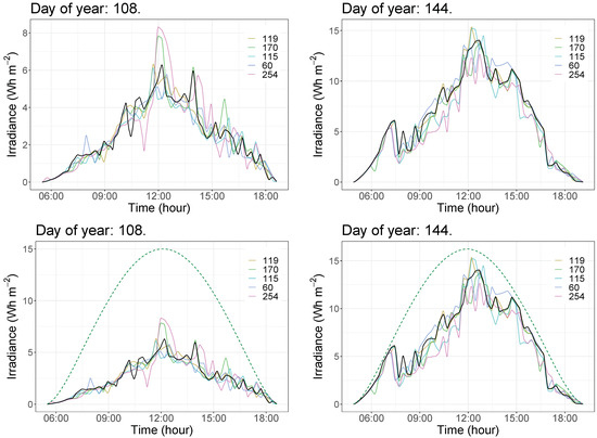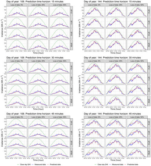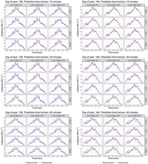 By considering the 2019 data for the methodology evaluation, the corresponding daily GHI curves are then forecast according to the preliminary selection of possible nodes and the different conditions. In summary, a global of 13,140 simulations were carried out by the authors. These estimated data allow us to analyze in detail the influence of each variable on the short-term forecasting accuracy and the different possibilities to implement a real sensoring network in terms of data gathering accuracy and reliability for forecasting purposes. As an example of the forecast curves for each day, Figure 10 shows the irradiance data corresponding to two arbitrary days—labeled as day 108 and 144, respectively, including clear sky GHI data—see dashed line. As can be seen, data corresponding to the selected nodes given in Figure 9 are plotted, as well as the forecasting point marked in black color being the GHI observed data—corresponding to Y k ( t + h ) . From these initial data, Figure 11 compares the measured and forecast irradiance values for the two previous days—labeled as day 108 and 144—and considers the selected different conditions for each day: loss of data percentages, different SF parameters, and different forecasting time intervals. Subsequently, 36 different forecasting GHI results are determined for each day. In addition, as a complementary result, Figure 12 compares these curves, including the expected clear sky GHI values. These forecasting data are thus determined for 15, 30, and 45 min time horizons, varying the SF parameter from 09 to 12 and considering 0%, 25%, and 50% loss of data scenarios.