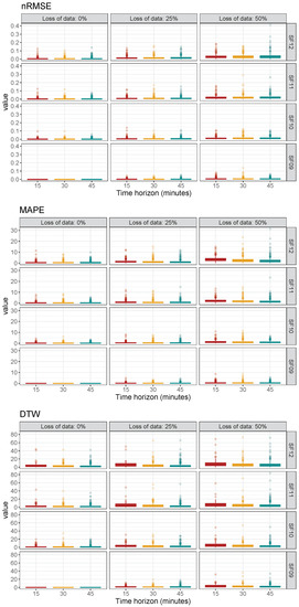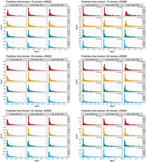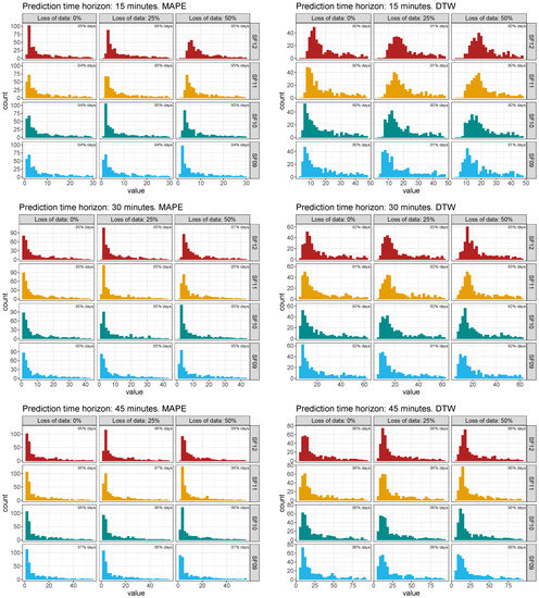 With the aim of estimating the influence of each parameters by considering all simulations along the 2019 data, a sensitive analysis was carried out determining discrepancies between the estimated daily GHI values for the selected node and the corresponding daily measured GHI values. Firstly, Figure 13 shows the global histograms and the truncated histograms of such discrepancies based on normalized root mean square error (nRMSE) among the measured GHI data and the forecasting GHI values for the selected node and by considering the different time horizon, SF, and loss of data scenarios. Therefore, 36 global and truncated histograms were determined from the 13,140 simulations. As can be seen, the truncated histograms retain more than 90% of such discrepancies and are considered suitable enough for this sensitive analysis. Secondly, and according to the variety of errors and differences available in the specific literature, as well as the comparison conducted by the authors in [83], the mean absolute percentage error (MAPE) and dynamic time warping (DTW) were also selected as metric estimations—see Section 3.3. Indeed, and as can be found in [92], DTW is considered as an appropriate technique to estimate and find an optimal alignment between two time-dependent sequences under a set of restrictions. DTW was initially used to compare different speech patterns, and also successfully applied in other fields, such as information retrieval and data mining. Additionally, DTW can be applied to detect and cope with different speeds and time deformations associated with time-dependent data. Recently, the R package IncDTW based on the DTW improved the possibilities to classify time series or clusters [93]. To analyze in detail the influence of each variable, Figure 14 shows the truncated histogram for these simulations using discrepancies based on MAPE and DTW metrics. As can be seen from these discrepancies, a higher loss of data range involves more relevant discrepancies, and these values present a secondary peak from 20% to 30% values. In terms of SF parameter, the vast values of discrepancies slightly shift from the [0, 10] interval (for SF09) to [10, 20] interval (for SF12). Therefore, a longer time interval between subsequent packets—see Table 3—implies higher discrepancy errors. These results are similar for the other analyzed forecasting short time intervals—30 and 45 min, respectively, as summarized in Figure 14.