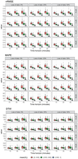 Finally, an additional metric analysis is also provided to compare the difference evolution of SF09, 0% loss of data (corresponding to “Scenario 1” in Figure 4), and for each short time interval to the rest of the other daily possible conditions and under nRMSE, MAPE, and DTW metric estimations. With this aim, Figure 16 summarizes the boxplot results of differences among “Scenario 1” (for each short time interval) and the other daily conditions (SF values, loss of data, and short-term time intervals). As can be seen, differences are higher with larger loss of data for any metric—see boxplots for the same row and short time interval. In addition, discrepancies are increasing from SF09 to SF12, when loss of data and short time interval variables are kept constant. The results under different daily conditions are divided by considering clear sky GHI ratio intervals K ¯ t —[0, 0.65], (0.65, 0.85], and (0.85, 1]. The corresponding boxplot differences for SF09, 0% loss of data, and for each short time interval in comparison to the rest of daily conditions and for all metrics are determined and depicted in Figure 17. In general, differences are higher for lower K ¯ t values and, as previously affirmed, low K ¯ t GHI ratio days should be considered for evaluating GHI forecasting accuracy approaches and suitable node layouts. Consequently, and depending on the discrepancies range allowed in each case by the specific application, this methodology gives a preliminary analysis for the LoRa-based PV monitoring architectures and potential node layouts. Additionally, it gives an estimation of forecasting GHI estimations and the influence of SF and loss of data variables on the GHI value accuracy. Therefore, both reliability and robustness of the collected data to be used for forecasting purposes are able to be analyzed and evaluated.