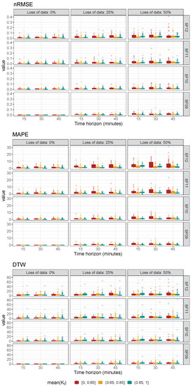 As an alternative sensitive analysis, Figure 15 shows a boxplot diagram of the discrepancies based on nRMSE, MAPE, and DTW metrics classified according to different clear sky GHI ratio K ¯ t : [0, 0.65], (0.65, 0.85], and (0.85, 1], respectively. All simulations corresponding to 2019 data are considered to determine these global metrics; thus, 36 different conditions are assumed for each day depending on the defined 3 × 4 × 3 matrix of possible loss of data, SF parameter, and short time period values selected for this case study. From the results, larger time horizons address less-accurate GHI estimations, and higher clear sky GHI ratio values imply more accurate GHI estimations. Moreover, high K ¯ t GHI ratio days should be not considered for LoRa network performance evaluation, as they are not sensitive to loss of data nor SF parameter values. Subsequently, low K ¯ t GHI ratio days should be considered for estimating discrepancies and GHI forecasting accuracy, as well as potential errors allowed for short-term forecasting purposes depending on the corresponding loss of data, short time periods, and SF parameters.