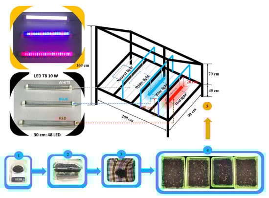 - Yun, K.; Youbin, Z. Variation of phenotypic responses to lighting using a combination of red and blue light-emitting diodes versus darkness in seedlings of 18 vegetable genotypes. Can. J. Plant Sci. 2019, 99, 159–172. [Google Scholar]