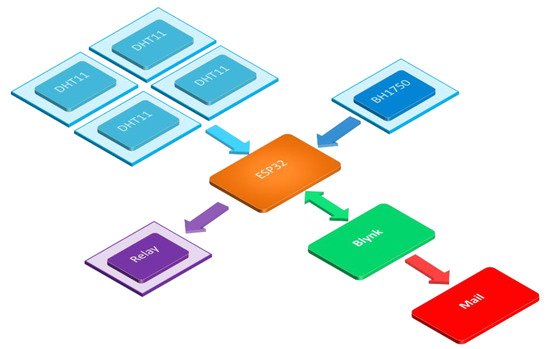 Figure 4 shows the details of the circuit diagram for an environmental sensing system. The electronic components of the device consisted of microcontroller (ESP32), relay, temperature and humidity sensor (DHT11), and ambient light sensor (BH1750FVI). We used 10 pins to connect all sensors with the ESP32 board. The pins were 3.3 V pin, 2 GND pins, 5 multiplexed IO pins, CLK pin, and SD0 pin. There are still many pins that were not in use, which could be useful for our system improvements and scaling in the future using the same board. One relay and four sensors of DHT11 digital temperature and humidity were used. The relay control pin was connected to the ESP32′s IO12 pin in order to control the LEDs on/off switch. The data pin of the sensors was connected to IO25, IO27, IO32, and IO34 pin of the ESP32 board. The exclusive digital signal acquisition process for sensing humidity and temperature of the DHT11 sensor ensured high reliability and excellent long-term stability. The humidity accuracy, temperature accuracy, and resolution were ±5% RH, ±2 °C, and 1, respectively. The BH1750FVI device, a digital ambient light sensor for the I2C bus interface, was selected to use in this study. The VCC pin of the sensor was connected to the 3v3 pin, while the GND pin was connected to GND pin on the ESP32 board. The SCL (serial clock) pin of the sensor was connected to the CLK pin and the SDA (serial data) pin of the sensor was connected to the SD0 pin of the ESP32. These four connections were part of a standard i2c hardware connection to the I2C sensor.