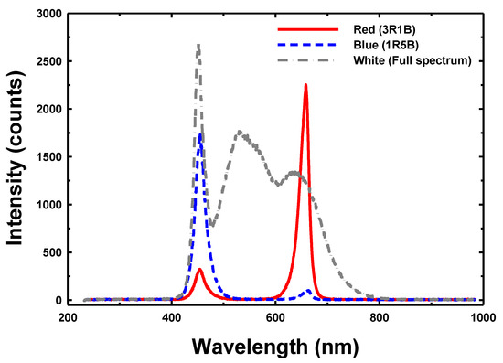 In this study, we installed the LED light close to the nursery tray. Therefore, we used LED tubes T8 consisting of LEDs with primary optics attached. The LED tubes T8 had a wide light distribution pattern to examine the effects of different light wavelength on sunflower (Helianthus annuus) sprouts that were stimulated during the night. The light spectra of LEDs were monitored using an Ocean Optics HR2000 spectrometer interfaced and connected to a personal computer via a USB port. The relative spectra of the light treatments are shown in Figure 5. Red (3R1B) light: 75% red LED light with a wavelength of 660 nm and 25% blue light with a wavelength of 460 nm; blue (1R5B) light: 16.7% red LED light with a wavelength of 660 nm and 83.3% blue light with a wavelength of 460 nm; white (full-spectrum) light with a wavelength of 420–780 nm. The length of the LED lamps was 30 cm with a power of 10 W. The sun was the source of natural light (control), which had a different light intensity within the nursery at different times of the day.