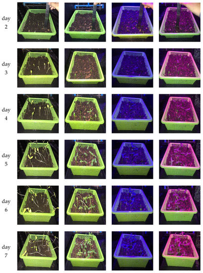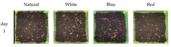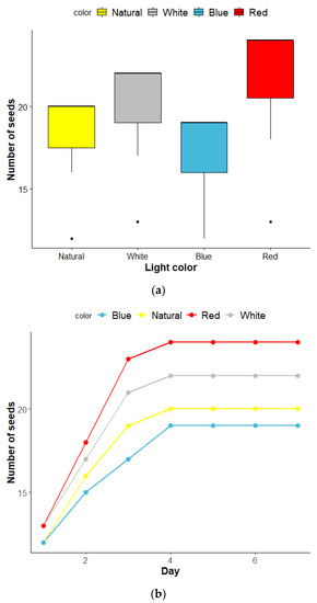 Figure 6 represents sunflower seedlings treated under four different light sources, which were natural, white, red, and blue light LEDs for 7 days. Sunflower seed germination was significantly affected by the light spectrum ( = 7.94, p = 0.0472). Figure 7a,b, respectively, show a comparison of the number of germinated seeds between treatments and the number of seeds germinated each day until the end of the process. During the first few days of germination, it was observed that the four different light sources resulted in different germination success numbers: 24 for red, 22 for white, 20 for natural, and 19 for blue light, which accounted for germination percentages of 80%, 73.33%, 66.67%, and 63.33%, respectively.