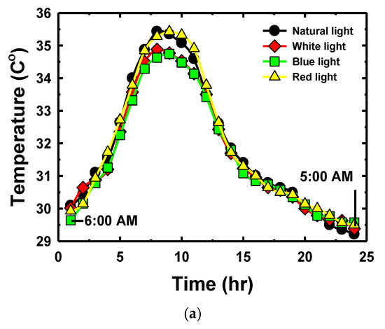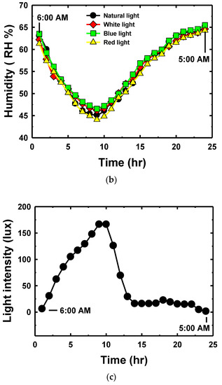 Figure 8a shows the mean temperature of each day for seven days in the nursery trays under four bands of light from 6:00 a.m. to 5:59 a.m. The mean temperature of the nursery trays under the four bands of light in the range of 5:00 a.m. to 6:00 a.m. (the connection point between day and night) was 29.67 °C. The mean temperature between 9:00 a.m. and 3:00 a.m. was 33.73 °C, temperature differences in the four culture trays during this period was ±0.28 °C. The mean of temperature at noon of the four trays was 35.07 °C; the trays on the left (natural light) and right sides (red light) of the nursery were slightly higher than the trays inside (white and blue light) which has a difference value in the range of ±0.37 °C. Figure 8b shows the mean humidity of each day for seven days in the culture trays under the four bands of light from 6:00 a.m. to 5:59 a.m. It shows that the mean humidity of the culture trays under the four light bands in the range of 5:00 a.m. to 6:00 a.m. was 63.71%. The mean humidity from 9:00 a.m. to 3:00 a.m. was 48.50%, and the humidity differences in the four culture trays during this period was ±0.81%. The mean temperature of all trays was similar and had a similar variation pattern. The measured humidity was inversely proportional to the temperature. Figure 8c shows the luminance of the light inside of the plant nursery. The luminance of the light at 6:00 a.m. and at 5:00 a.m. was 3.34 and 3.14 lux, respectively. From 2:00 p.m. to 3:00 p.m., the average luminance value was 171.26 lux. Then, the luminosity decreased until 5:00 p.m. when it reached a value of 31.33 lux. The average of luminance value between 7:00 p.m. and 3:00 a.m. was 16.95 lux. The average temperature, humidity, and luminosity for each time period during the day and night in the nursery are shown in Table 2. During the day, there were four periods, each with a duration of three hours, starting from 6 am. to 6 pm. At night, we considered only one period (a total of 12 h). The temperature in the nursery during the day ranged from 30.40 to 34.92 °C, with an average of 33.03 °C. While the humidity in the nursery during the day ranged from 46.18% to 58.73%, with an average of 50.88%. From the measurement results, it was found that the temperature at the natural light location and the LED light installation location were similar with a slight difference (less than 1 °C). The results clearly showed that the light that came from the LED tube did not generate enough heat to affect the DHT11 sensors and sunflower sprouts.