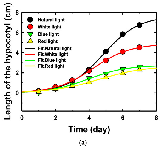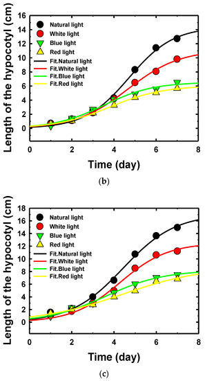 Vice versa, the sprouts grown under light, the shorten hypocotyl of light-grown sprouts may be due to the inactivation of constitutive photomorphogenic 1 (COP1), which is an inhibitor for photomorphogenesis and stability of long hypocotyl 5 (HY5), and long hypocotyl 5 homolog (HYH). It may also be derived from plant hormones, such as gibberellins, and ethylene may contribute to the light-controlled hypocotyl elongation [41,42]. Comparing red, blue, and white LED lights, LED white light alone could significantly increase hypocotyl length of sunflower sprouts when compared with red and blue light. This may be because white light has a spectrum closer to that of natural light than red and blue lights. The blue light makes hypocotyl longer than red; this is likely because blue light has a greater effect on hypocotyl stretching than red light. The above results contradict with previous research results [43], and this may be due to the difference in the period of time that the sunflower sprouts were exposed to light with different light intensities in the study. Moreover, we found that the sunflower sprouts grown under natural light had bending shapes, whereas sunflower seeds grown under light from light-emitting diodes had straight stem shapes. Probably because sunflower sprouts in the natural light group were not equally exposed to natural light in same the intensity and direction. Unlike sunflower seedlings in the group that received LED lights during the night, which has a constant direction and intensity, resulting in more straight shapes of sunflower sprouts. The lengths of the hypocotyl with respect to days of germination process can be expressed as a Sigmoid function of germination date as shown in Table 4. Figure 10a shows the comparison among light groups, and it is observed that the lengths of stems under natural light were higher than those under the other three light spectra. Moreover, the same behavior was also observed when comparing by length group (Figure 10b).