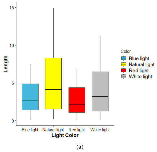 The comparison between the lengths of stems of sunflower seedling treated under four light spectra corresponding to days of germination process is shown in Figure 9a–c, respectively, for the length groups A, B, and C. The results show a trend in which the lengths of stems in every treatment were similar during the first few days of germinated seeds, which shows that the color of light did not have an effect on the germinated seeds at early stages. However, from the 4th day onwards, the results displayed larger differences in stem length between each treatment. Group C was observed to display growth saturation in sprouts under all four colors of light. In groups A and B, a slight slowing of growth was observed in sprouts grown under natural light, whereas there was no growth saturation under the light-emitting diode light. It is possible groups A and B under light-emitting diode light might grow for a longer period.