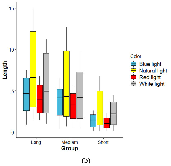 The hypocotyl was stimulated by four different light sources during the night. We found that there was no significant difference in the length of the hypocotyl (= 3.68, p = 0.298). However, we observed that the germinated seeds treated under the four narrow-band LEDs had different stem lengths and could be classified into different size groups. For better analysis, we divided them into three groups; short (group A), medium (group B), and long (group C) (see Table 3).