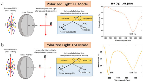Schematic view of SPR and LMR excitation for: (a) Horizontally polarized light (only LMRTE is excited); (b) Vertically polarized light (SPR and LMRTM are excited).