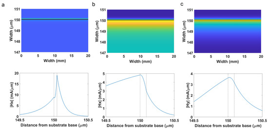 Optical field intensity distribution and transversal magnetic field in the upper part of the cross section of the 150 µm coverslip coated with (a) silver (mode TM1 at wavelength 450 nm) and (b,c) ITO (modes TE0 and TM0 at wavelengths 1050 and 750 nm respectively).