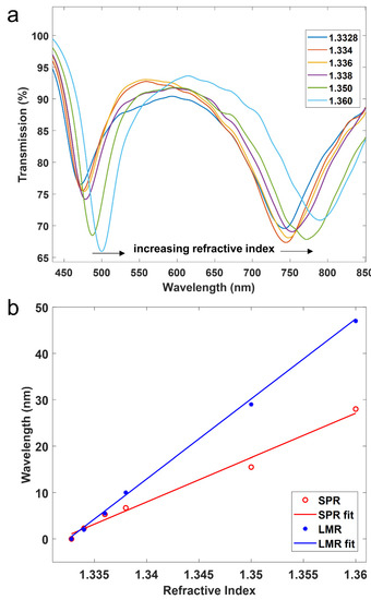 In order to analyze the performance of the device as a sensor, the two regions of the coverslip were covered with liquids of different refractive indices (water and ethanol 70%) in the range from 1.3328 to 1.3620. For the sake of simplicity, only the case of TM polarization was analyzed because it permits us to visualize in the same spectrum the SPR and the LMRTM (see Figure 6). The results show that both resonances experience a wavelength shift to the red as a function of the refractive index, though the sensitivity for the LMR (1720.6 nm/RIU) is higher than the sensitivity of the SPR (1029.4 nm/RIU). However, it must be pointed out that the sensitivity in optical sensors typically increases at longer wavelengths. Therefore, no big difference in terms of sensitivity can be extracted from these results [22]. In addition, these sensitivity values are in the typical range of sensitivity observed with other materials deposited on coverslips and characterized with the same setup used here [19,22], and when compared to other optical sensors, they are in a good position in the global scale, though sensors do exist with one order of magnitude higher. Generating the resonance in the near infrared could improve the sensitivity [27].