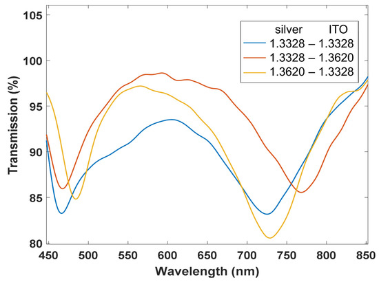 In addition, in Figure 7 some results are shown on the effect of covering the silver and the ITO coated regions with different liquids. The results indicate that both resonances operate independently and, therefore, the sensitivity in each peak is the same as in a setup where either of the coatings is deposited separately.