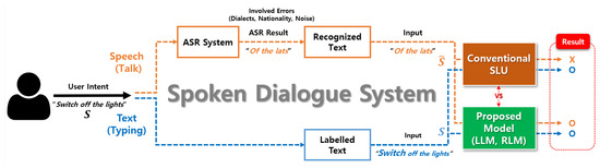 Although several text-based SLU models have been proposed [1,2,3,4,5,6], their approaches are difficult to realize in practical scenarios, where unexpected text errors obtained by automatic speech recognition (ASR) systems are prevalent. This is because erroneous ASR results make the intent classification model unable to accurately understand the users’ intents and orders. Due to the diverse users’ speech in various speaking styles and additive background noise, the ASR system may not be able to properly understand the users’ intents. For these reasons, utilizing the intent classification model trained only from the text-formatted dataset for the spoken dialogue system is not effective. To be used in practical dialogue-oriented systems, an automatic speech recognition-spoken language understanding (ASR-SLU)-based approach that is able to handle the various conditions will be required.