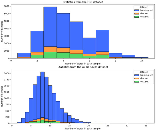 Figure 2 shows the statistics of the two datasets. Overall samples in the FSC dataset have a range of one to ten words. In particular, samples that contain two to four words are the most common. Since the FSC dataset is aimed at operating smart home devices, such as AI speaker appliances, the samples have shown that they are used in limited locations in a house, such as a kitchen, a living room, and a bathroom. For the same reason, the average utterance length of the FSC dataset is relatively short in comparison to the Audio-Snips dataset.